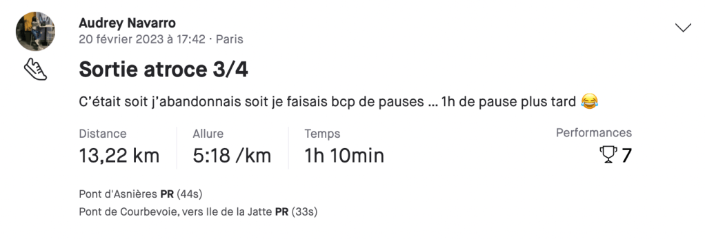 Bref, 37e kilomètre, je pleure et supplie Alex de me laisser marcher. Il me demande de lui jurer que je ne peux pas continuer. Je ne peux pas jurer un truc faux puisque physiquement ça va, donc je me tais et continue. Je pense à ma famille qui me suivait (du moins jusqu’à ce que l’appli bug), je vois aussi tous les messages de mes super amis que j’avais briefés avant la course pour qu’ils m’écrivent à partir du 30e kilomètre et surtout je ne me vois pas ne pas terminer cette course que j’avais tant préparé.